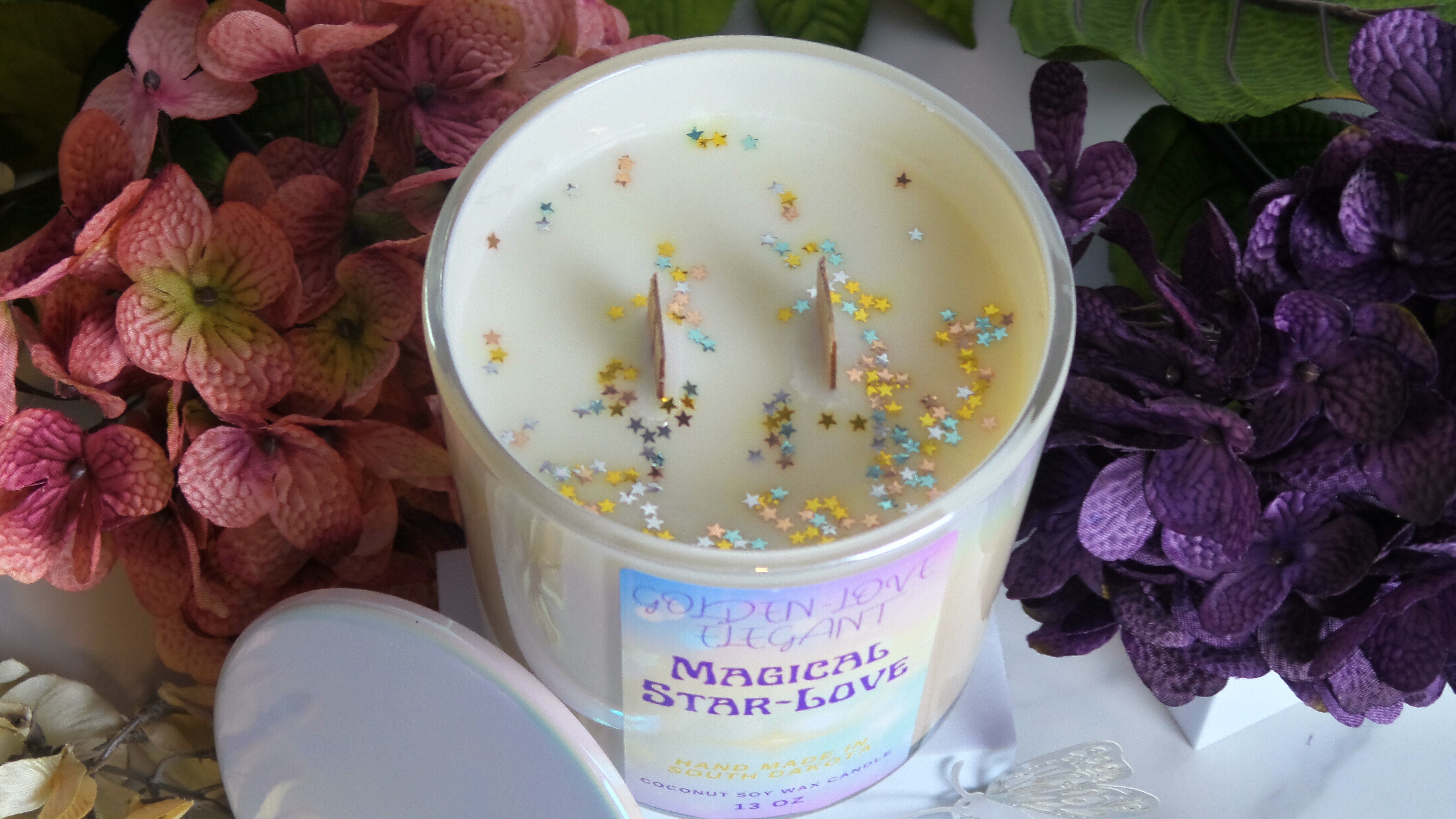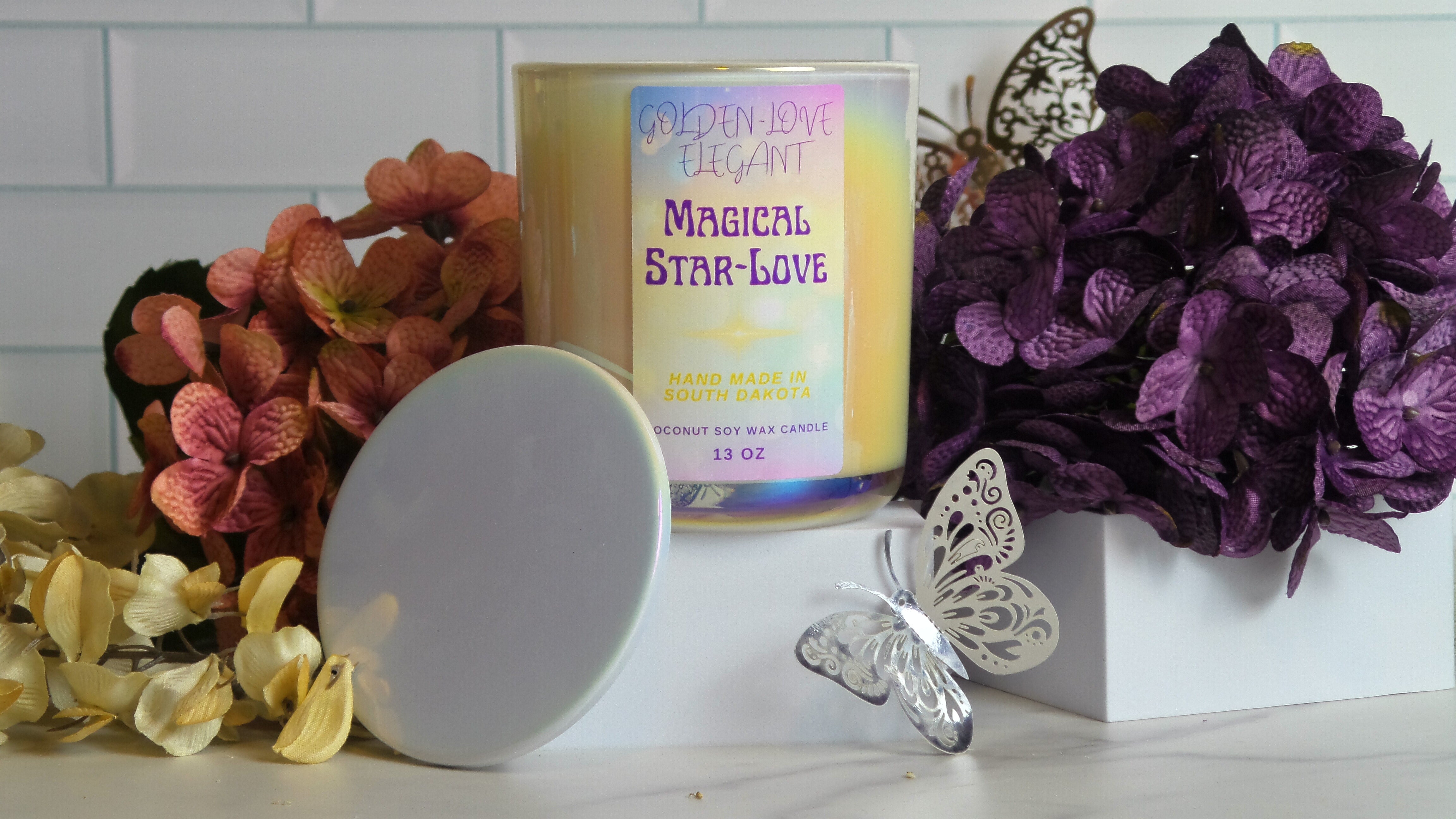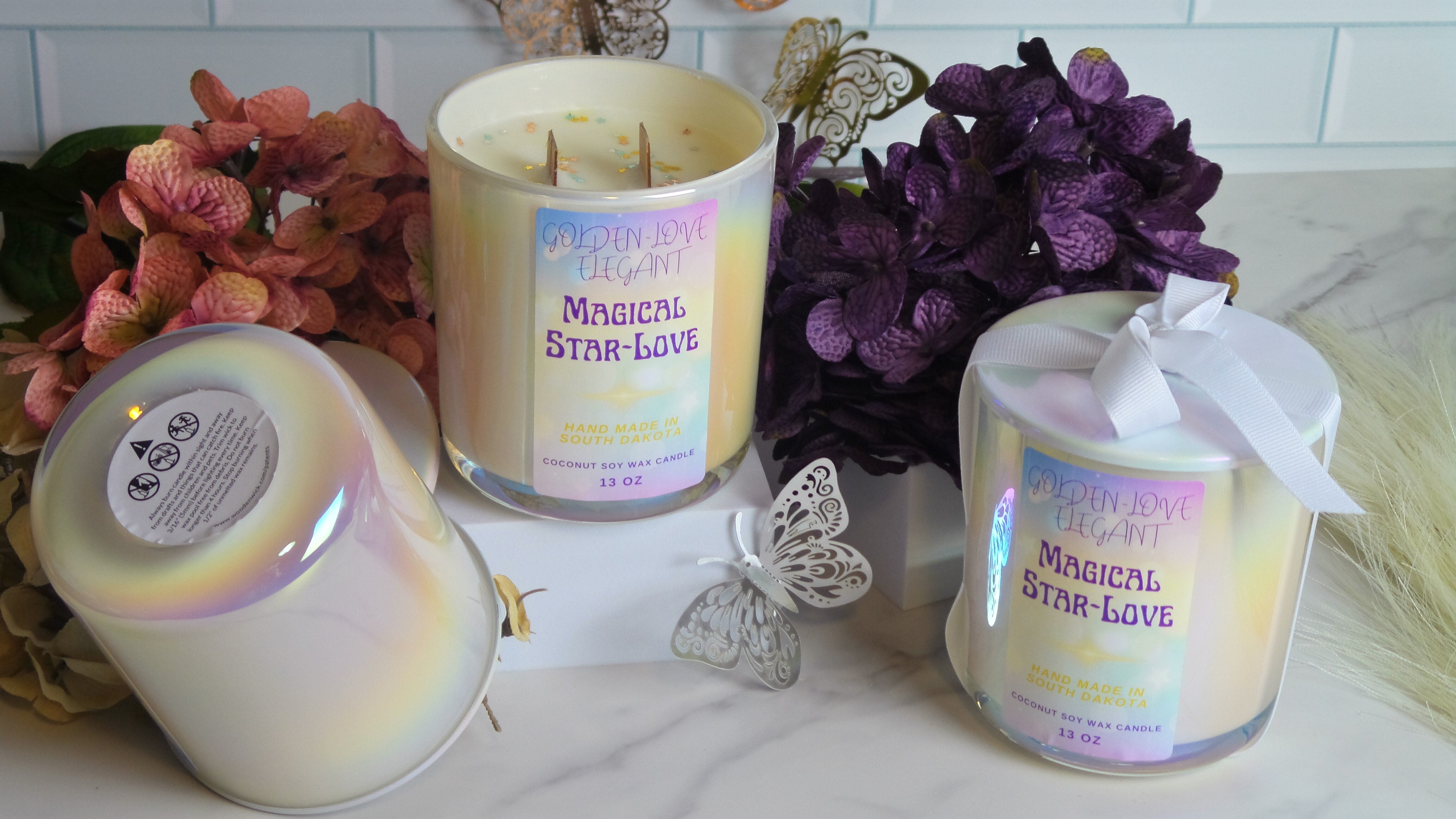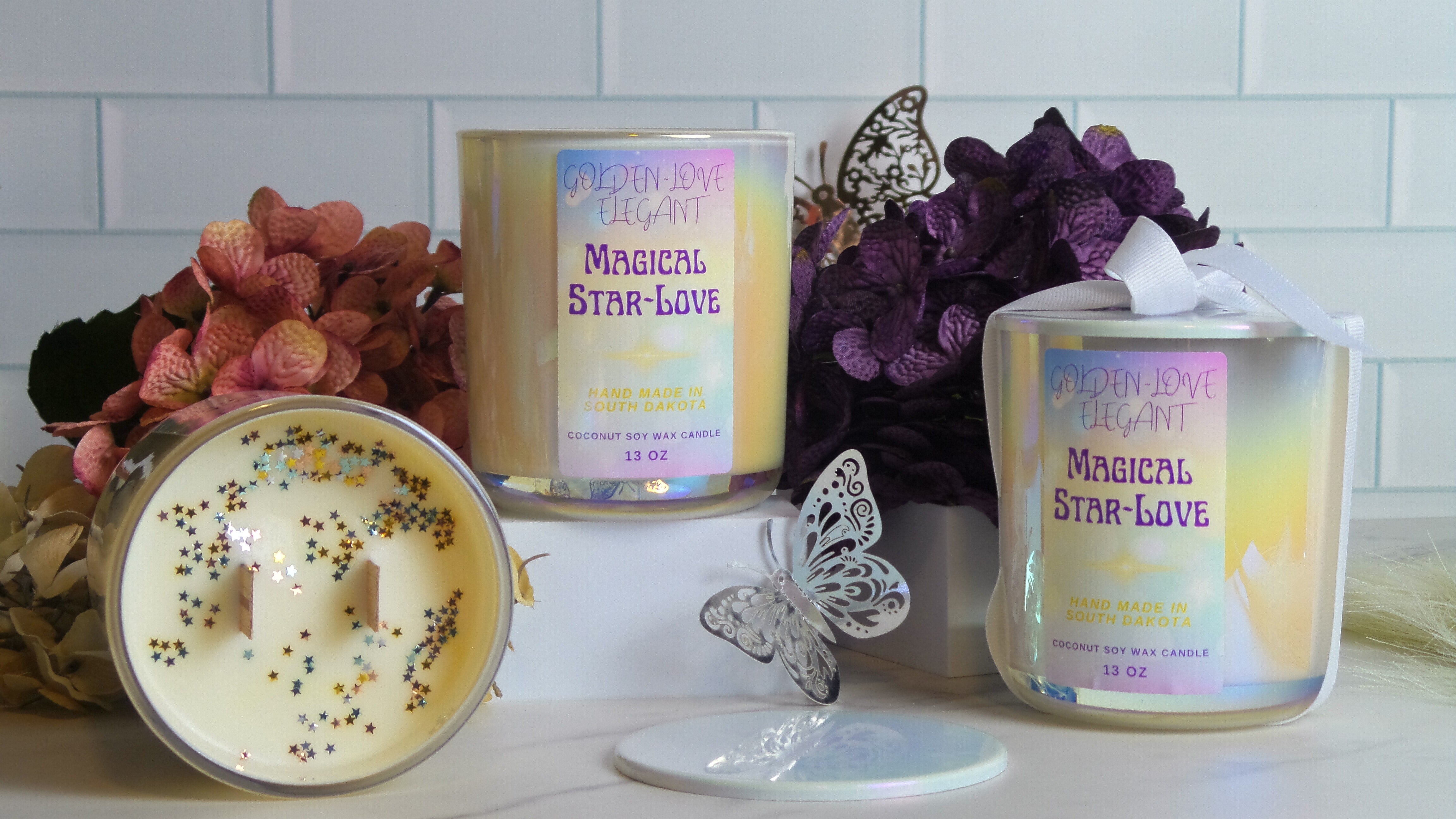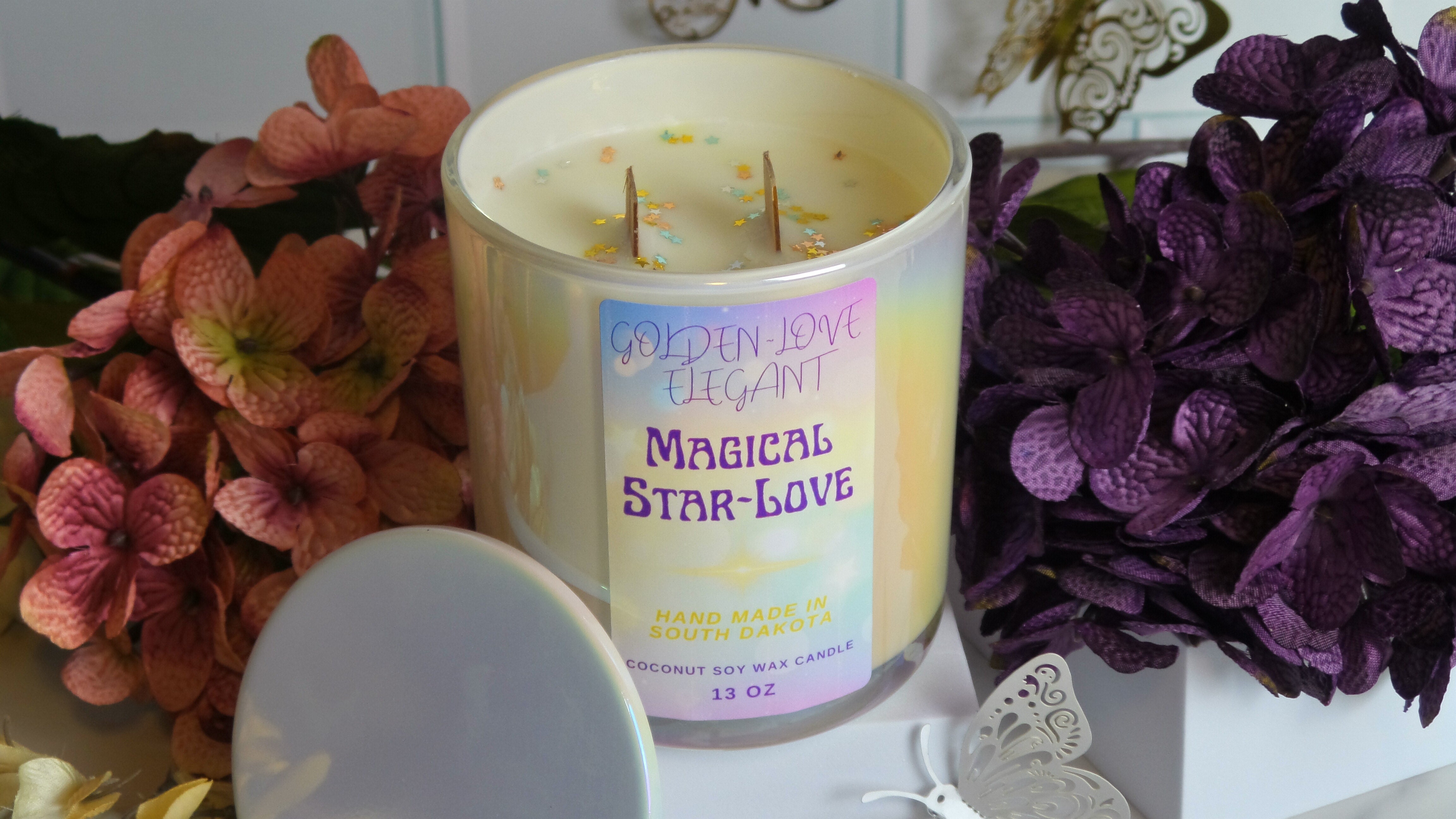 The Magical Star-Love luxurious candle is scented with watermelon, a splash of lemon and a hint of sugar, this candle will create the vibe and enhance the aroma in the air. The top of the candle is topped off with a sprinkle of magical glittery stars and wrapped in a white bow. Among the stars is two clean burning soft crackling wood wick that add an elegant crackling sound that brings a bonfire feeling to the comfort of your home. The Magical Star-Love candle is filled with an all-natural coconut soy wax blend, handmade in South Dakota and hand poured with love.